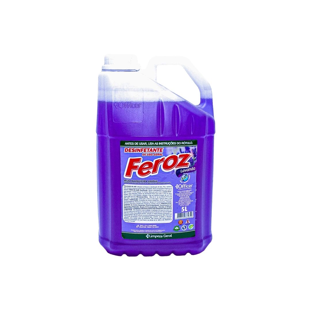 Desinfetante Feroz Lavanda Pronto Uso 5 litros O Desinfetante Feroz Lavanda Pronto Uso 5 litros limpa, perfuma e desinfeta com eficiência diversos ambientes. É fundamental para a saúde de nossa família um ambiente limpe e higienizado, por isso o desinfetante é um produto essencial na hora da limpeza diária da nossa casa, empresa e lugares de lazer, por isso tem ação bactericida e germicida.